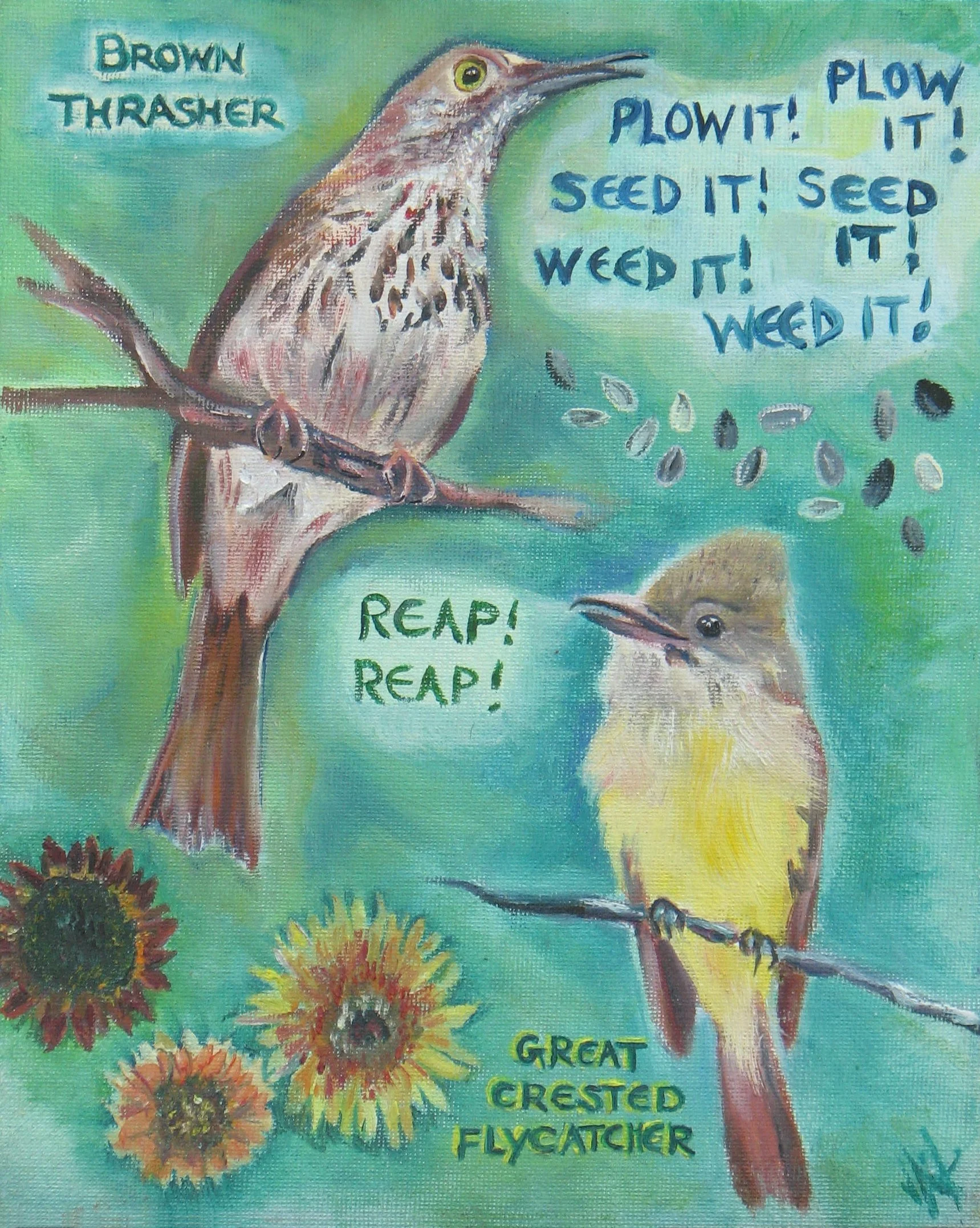 These illustrations came about because Iām an avid bird lover and identify them best by their songs/calls. Mnemonic phrases are used to identify/remember species by linking sounds and syllables with a phrase.